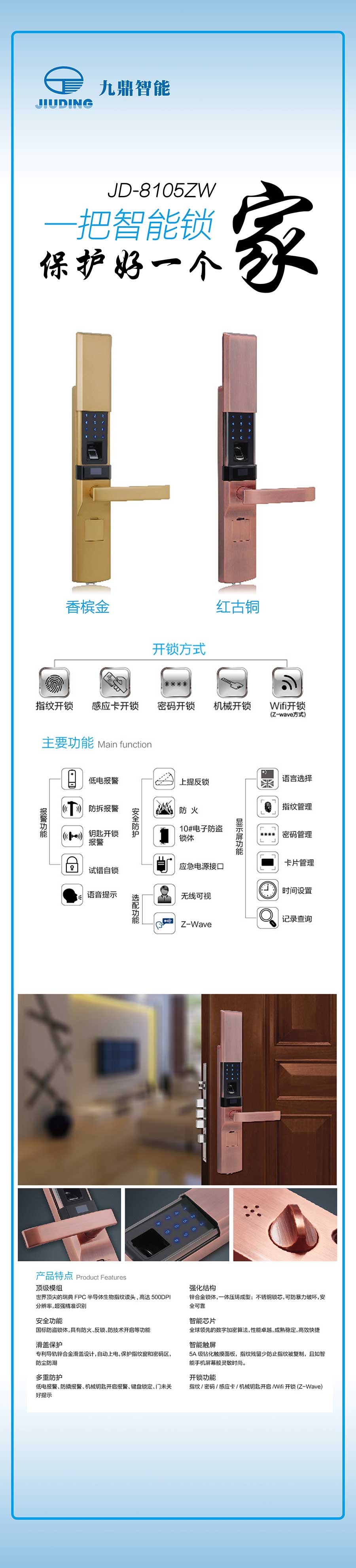 專利導軌鋅合金滑蓋設計,自動上電,保護指紋和密碼區,防塵防潮。